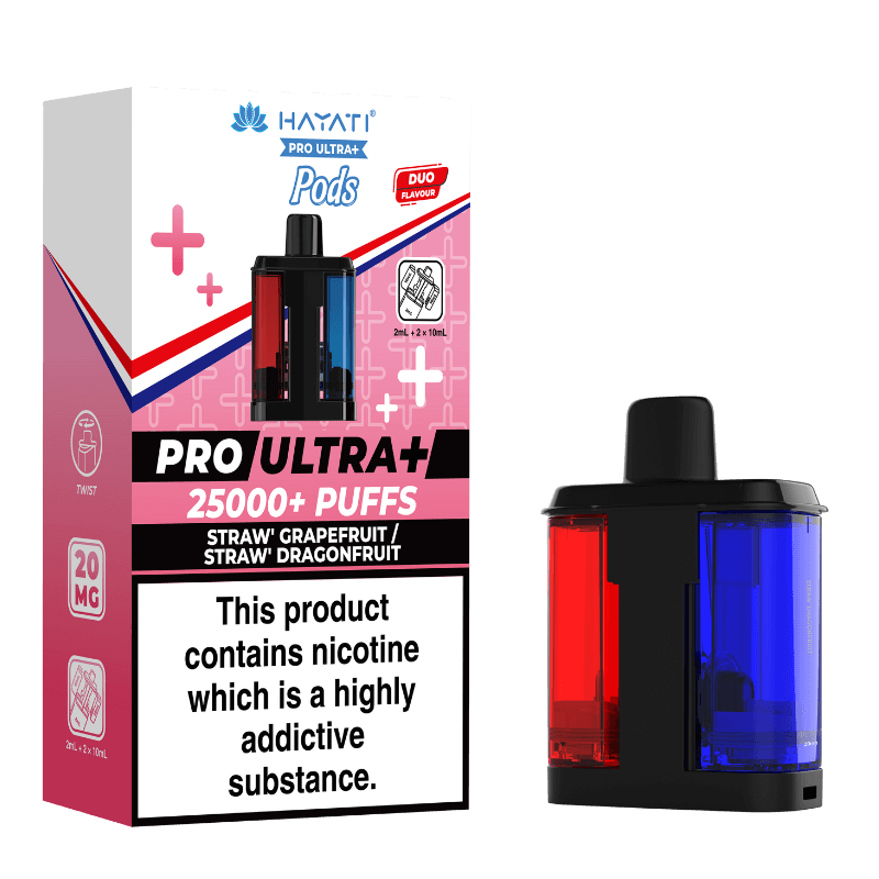 The Straw Cranberry and Straw Dragonfruit Hayati Pro Ultra Plus Refill Pack delivers a fruity fusion like no other. One flavour combines the sweetness of ripe strawberries with the sharp tartness of cranberries, while the other brings together juicy strawberries and tropical dragonfruit for a truly exotic experience. Perfect for vapers who love bold fruit combinations with a smooth finish.